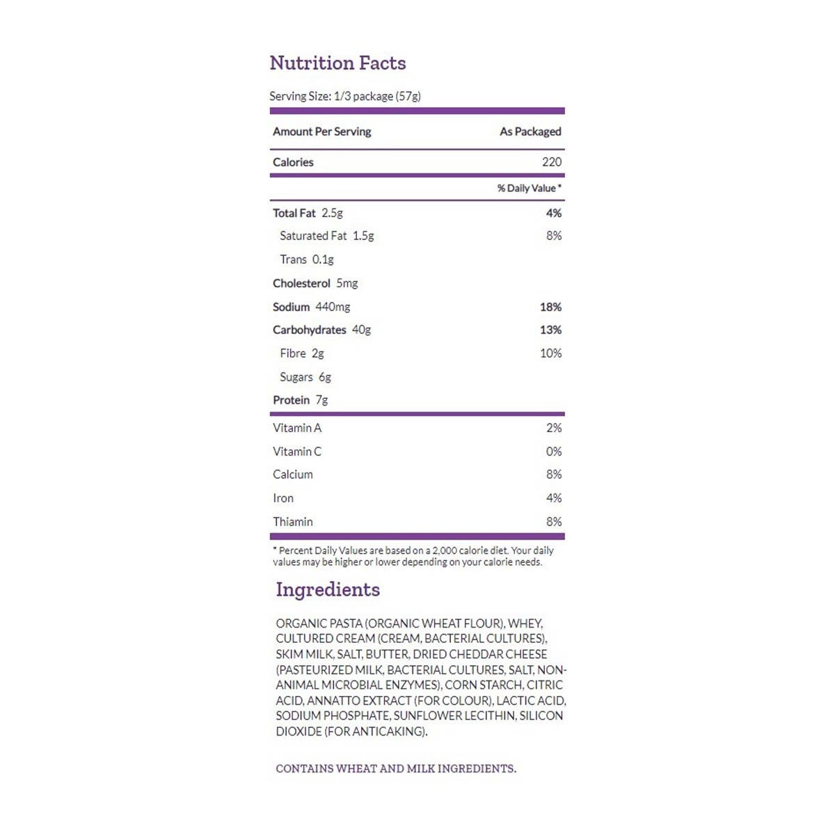 Organic Pasta (Organic Wheat Flour), Whey, Cultured Cream (Cream, Bacterial Cultures), Skim Milk, Salt, Butter, Dried Cheddar Cheese (Pasteurized Milk, Bacterial Cultures, Salt, Non-Animal Microbial Enzymes), Corn Starch, Citric Acid, Annatto Extract (For Colour), Lactic Acid, Sodium Phosphate, Sunflower Lecithin, Silicon Dioxide (For Anticaking).