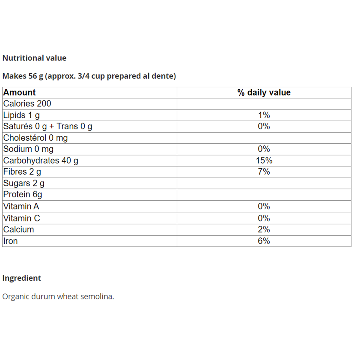 Organic durum wheat semolina.