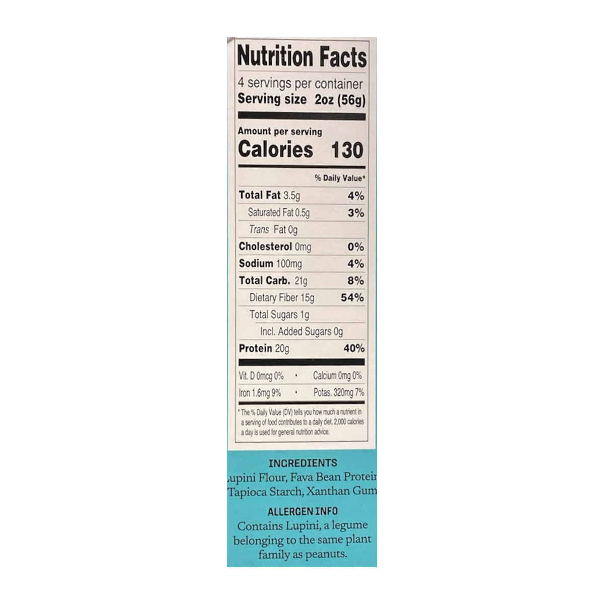 Lupini Flour, Fava Bean Protein, Tapioca Starch, Xanthan Gum.