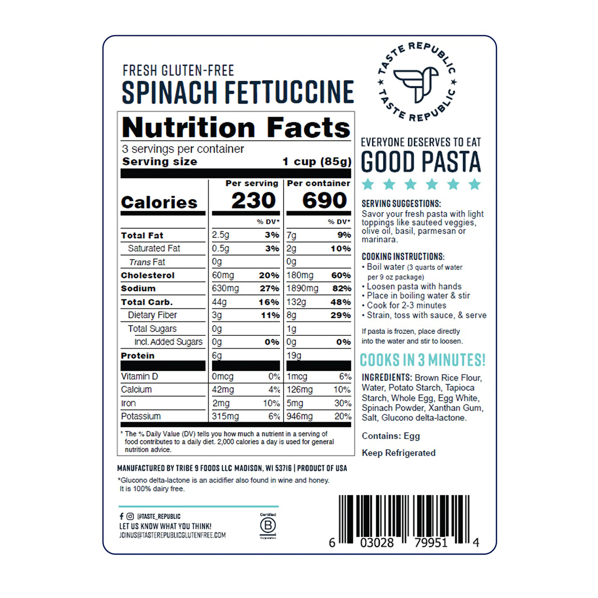 Since the spinach fettuccine is freshly made, it cooks to a perfect al dente in just 2-3 minutes. Toss with your favorite sauce and enjoy!