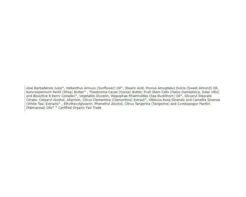 Aloe Barbadensis Juice*, Helianthus Annuus (Sunflower) Oil*, Stearic Acid, Prunus Amygdalus Dulcis (Sweet Almond) Oil, Butyrospermum Parkii (Shea) Butter* , Theobroma Cacao (Cocoa) Butter, Fruit Stem Cells (Malus Domestsica, Solar Vitis) and BioActive 8 Berry Complex*, Vegetable Glycerin, Hippophae Rhamnoides (Sea Buckthorn) Oil*, Glyceryl Stearate Citrate, Cetearyl Alcohol, Allantoin, Citrus Clementina (Clementine) Extract*, Hibiscus Rosa-Sinensis and Camellia Sinensis (White Tea) Extracts* , Ethylhexylglycerin, Phenethyl Alcohol, Citrus Tangerina (Tangerine) and Cymbopogon Martini (Palmarosa) Oils*. *Certified Organic Fair Trade.