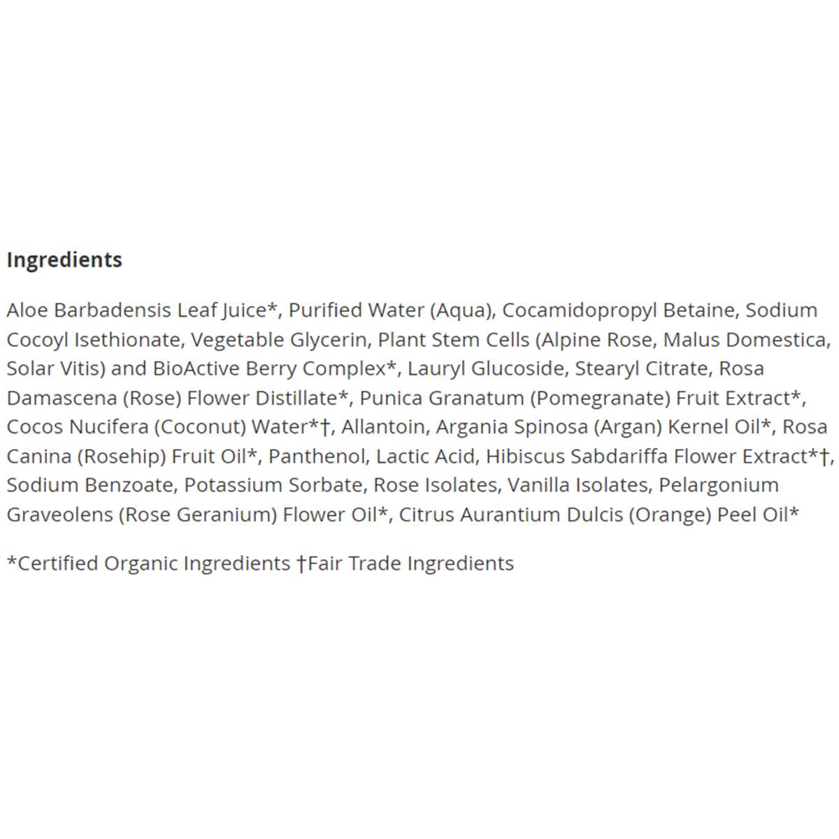 Aloe Barbadensis Leaf Juice*, Purified Water (Aqua), Cocamidopropyl Betaine, Sodium Cocoyl Isethionate, Vegetable Glycerin, Plant Stem Cells (Alpine Rose, Malus Domestica, Solar Vitis) and BioActive Berry Complex*, Lauryl Glucoside, Stearyl Citrate, Rosa Damascena (Rose) Flower Distillate*, Punica Granatum (Pomegranate) Fruit Extract*, Cocos Nucifera (Coconut) Water*†, Allantoin, Argania Spinosa (Argan) Kernel Oil*, Rosa Canina (Rosehip) Fruit Oil*, Panthenol, Lactic Acid, Hibiscus Sabdariffa Flower Extract*†, Sodium Benzoate, Potassium Sorbate, Rose Isolates, Vanilla Isolates, Botanical Extract Graveolens (Rose Geranium) Flower Oil*, Citrus Aurantium Dulcis (Orange) Peel Oil*Certified Organic Ingredients †Fair Trade Ingredients.