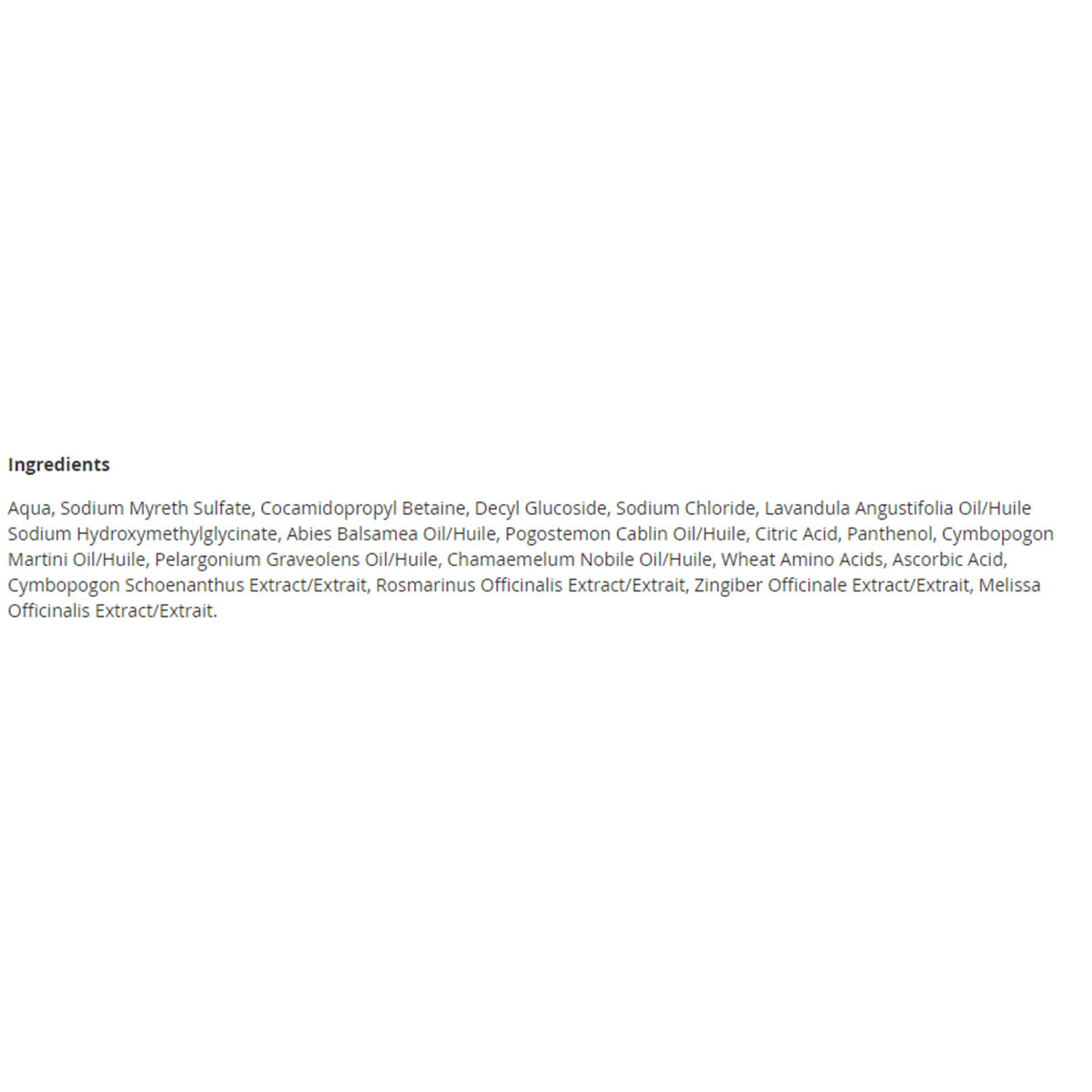 Aqua, Sodium Myreth Sulfate, Cocamidopropyl Betaine, Decyl Glucoside, Sodium Chloride, Lavandula Angustifolia Oil/Huile Sodium Hydroxymethylglycinate, Abies Balsamea Oil/Huile, Pogostemon Cablin Oil/Huile, Citric Acid, Panthenol, Cymbopogon Martini Oil/Huile, Botanical Extract Graveolens Oil/Huile, Chamaemelum Nobile Oil/Huile, Wheat Amino Acids, Ascorbic Acid, Cymbopogon Schoenanthus Extract/Extrait, Rosmarinus Officinalis Extract/Extrait, Zingiber Officinale Extract/Extrait, Melissa Officinalis Extract/Extrait.
