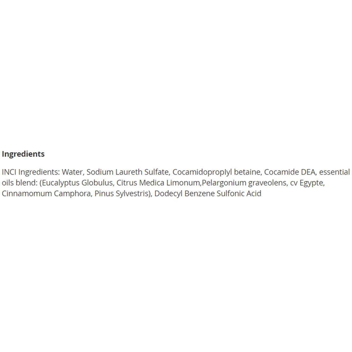 INCI Ingredients: Water, Sodium Laureth Sulfate, CocamidopropIyl betaine, Cocamide DEA, essential oils blend: (Eucalyptus Globulus, Citrus Medica Limonum,botanical extract graveolens, cv Egypte, Cinnamomum Camphora, Pinus Sylvestris), Dodecyl Benzene Sulfonic Acid.