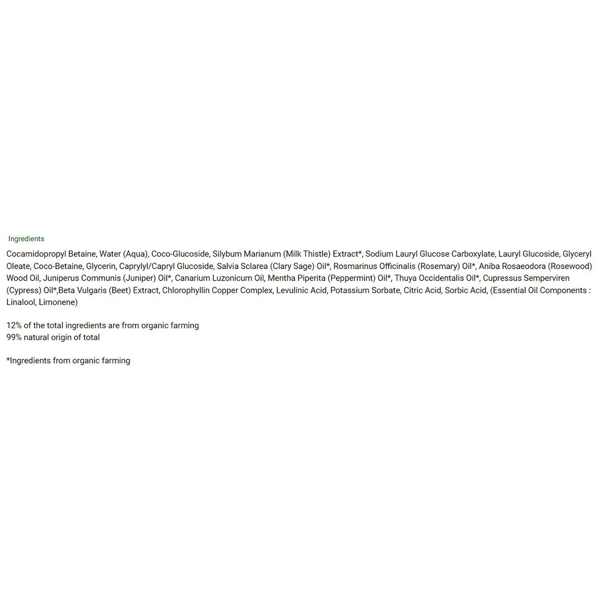 Cocamidopropyl Betaine, Water (Aqua), Coco-Glucoside, Silybum Marianum (Milk Thistle) Extract*, Sodium Lauryl Glucose Carboxylate, Lauryl Glucoside, Glyceryl Oleate, Coco-Betaine, Glycerin, Caprylyl/Capryl Glucoside, Salvia Sclarea (Clary Sage) Oil*, Rosmarinus Officinalis (Rosemary) Oil*, Aniba Rosaeodora (Rosewood) Wood Oil, Juniperus Communis (Juniper) Oil*, Canarium Luzonicum Oil, Mentha Piperita (Peppermint) Oil*, Thuya Occidentalis Oil*, Cupressus Semperviren (Cypress) Oil*, Beta Vulgaris (Beet) Extract, Chlorophyllin Copper Complex, Levulinic Acid, Potassium Sorbate, Citric Acid, Sorbic Acid, (Essential Oil Components: Linalool, Limonene).
