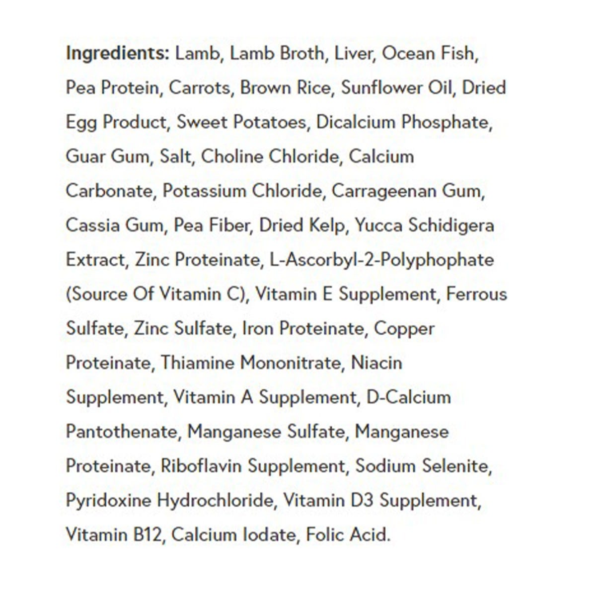 Lamb, Lamb Broth, Liver, Ocean Fish, Pea Protein, Carrots, Brown Rice, Sunflower Oil, Dried Egg Product, Sweet Potatoes, Dicalcium Phosphate, Guar Gum, Salt, Choline Chloride, Calcium Carbonate, Potassium Chloride, Carrageenan Gum, Cassia Gum, Pea Fiber, Dried Kelp, Yucca Schidigera Extract, Zinc Proteinate, L-Ascorbyl-2-Polyphophate (Source Of Vitamin C), Vitamin E Supplement, Ferrous Sulfate, Zinc Sulfate, Iron Proteinate, Copper Proteinate, Thiamine Mononitrate, Niacin Supplement, Vitamin A Supplement, D-Calcium Pantothenate, Manganese Sulfate, Manganese Proteinate, Riboflavin Supplement, Sodium Selenite, Pyridoxine Hydrochloride, Vitamin D3 Supplement, Vitamin B12, Calcium Iodate, Folic Acid.