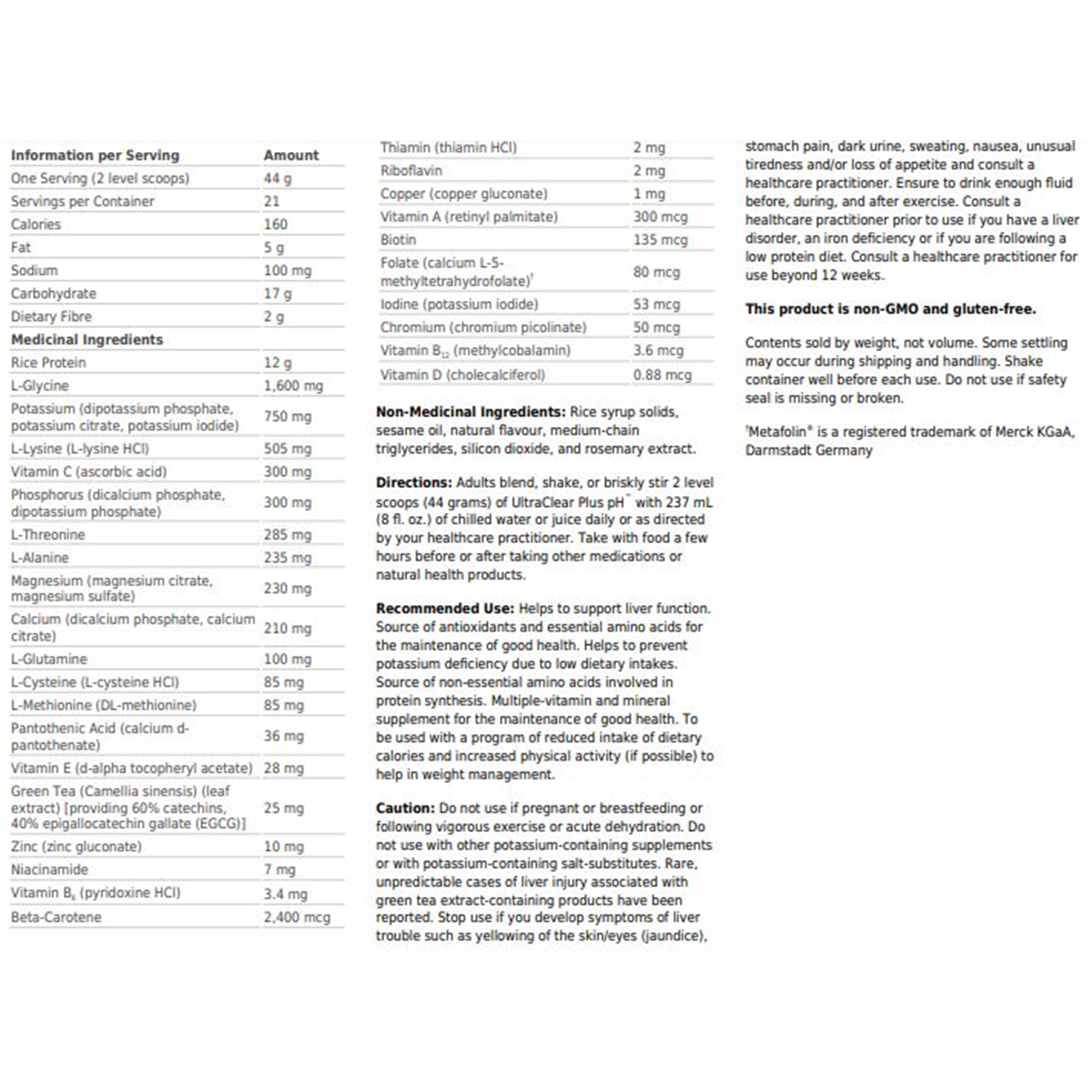 Adults blend, shake, or briskly stir 2 level scoops (46 grams) of UltraClear Plus pH with 237 mL (8 fl. oz.) of chilled water or juice daily or as directed by your healthcare practitioner. Take with food a few hours before or after taking other Health Products or natural health products.