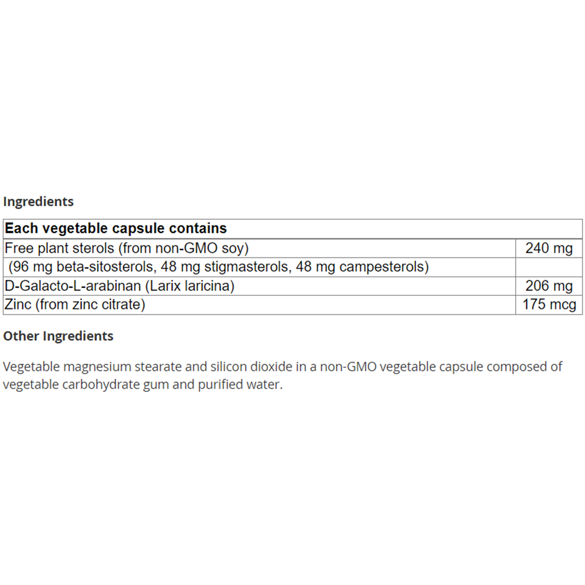 Vegetable magnesium stearate and silicon dioxide in a non-GMO vegetable capsule composed of vegetable carbohydrate gum and purified water.
