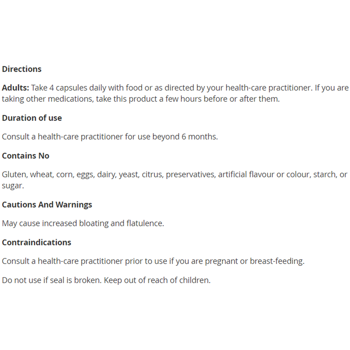 Adults: Take 4 capsules daily with food or as directed by your health-wellness-care practitioner. If you are taking other Health Products, take this product a few hours before or after them.