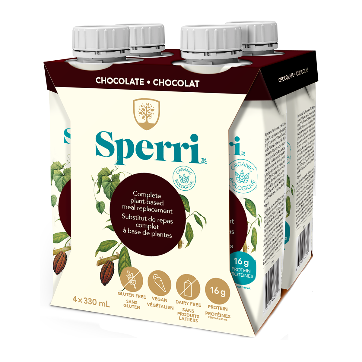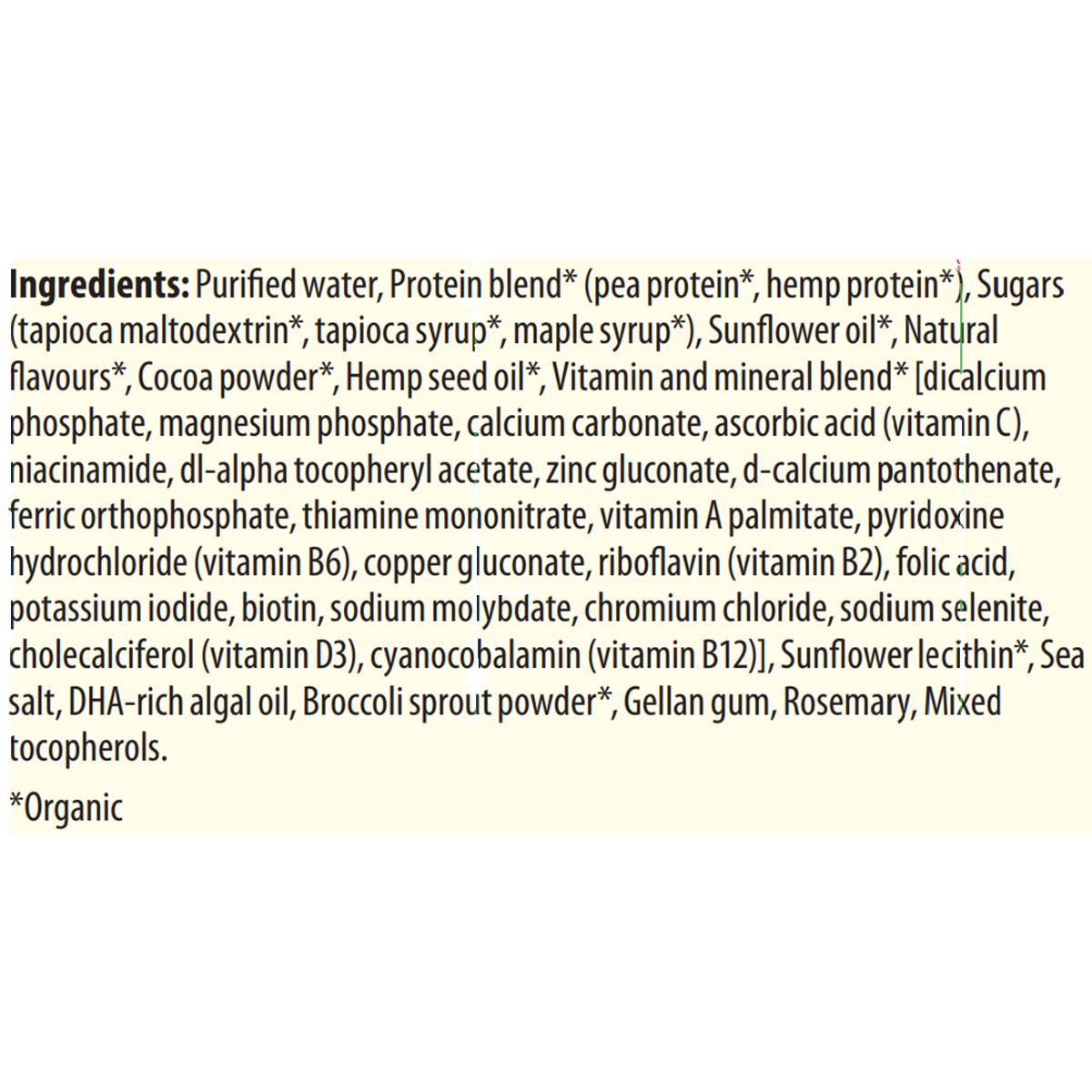 Purified water, Protein blend* (pea protein*, hemp protein*), Sugars (tapioca maltodextrin*, tapioca syrup*, maple syrup*), Sunflower oil*, Natural flavours*, Cocoa powder*, Hemp seed oil*, Vitamin and mineral blend* [dicalcium phosphate, magnesium phosphate, calcium carbonate, ascorbic acid (vitamin C), niacinamide, dl-alpha tocopheryl acetate, zinc gluconate, d-calcium pantothenate, ferric orthophosphate, thiamine mononitrate, vitamin A palmitate, pyridoxine hydrochloride (vitamin B6), copper gluconate, riboflavin (vitamin B2), folic acid, potassium iodide, biotin, sodium molybdate, chromium chloride, sodium selenite, cholecalciferol (vitamin D3), cyanocobalamin (vitamin B12)], Sunflower lecithin*, Sea salt, DHA-rich algal oil, Broccoli sprout powder*, Gellan gum, Rosemary, Mixed tocopherols.