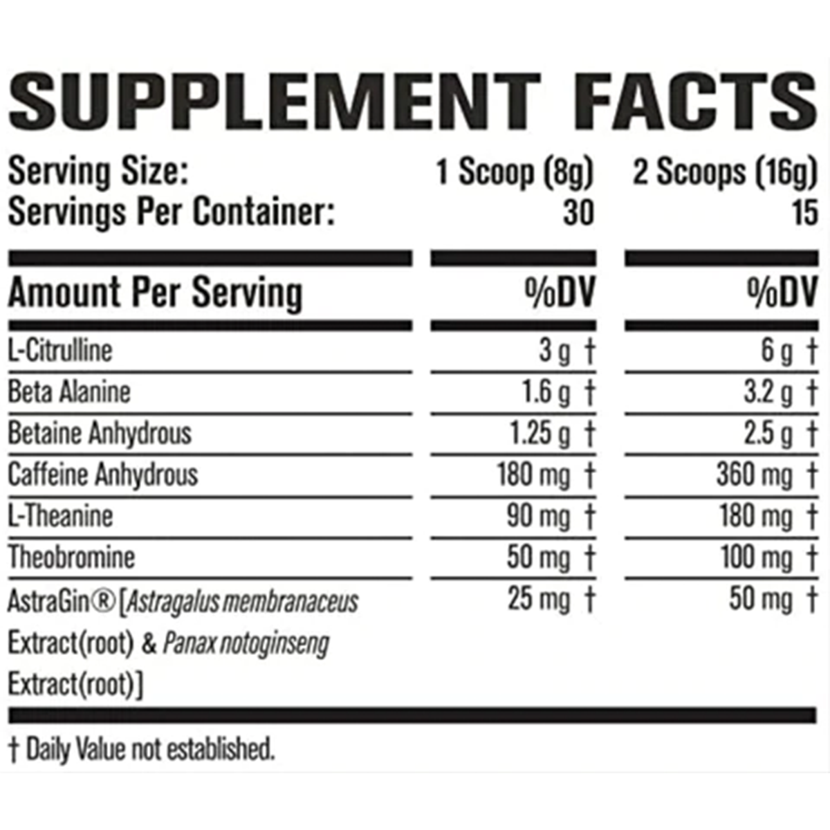The formula contains the most cutting-edge, potent ingredients available: L-Citrulline, Betaine Anhydrous, Beta Alanine, Caffeine, L Theanine, and it’s creatine-free.