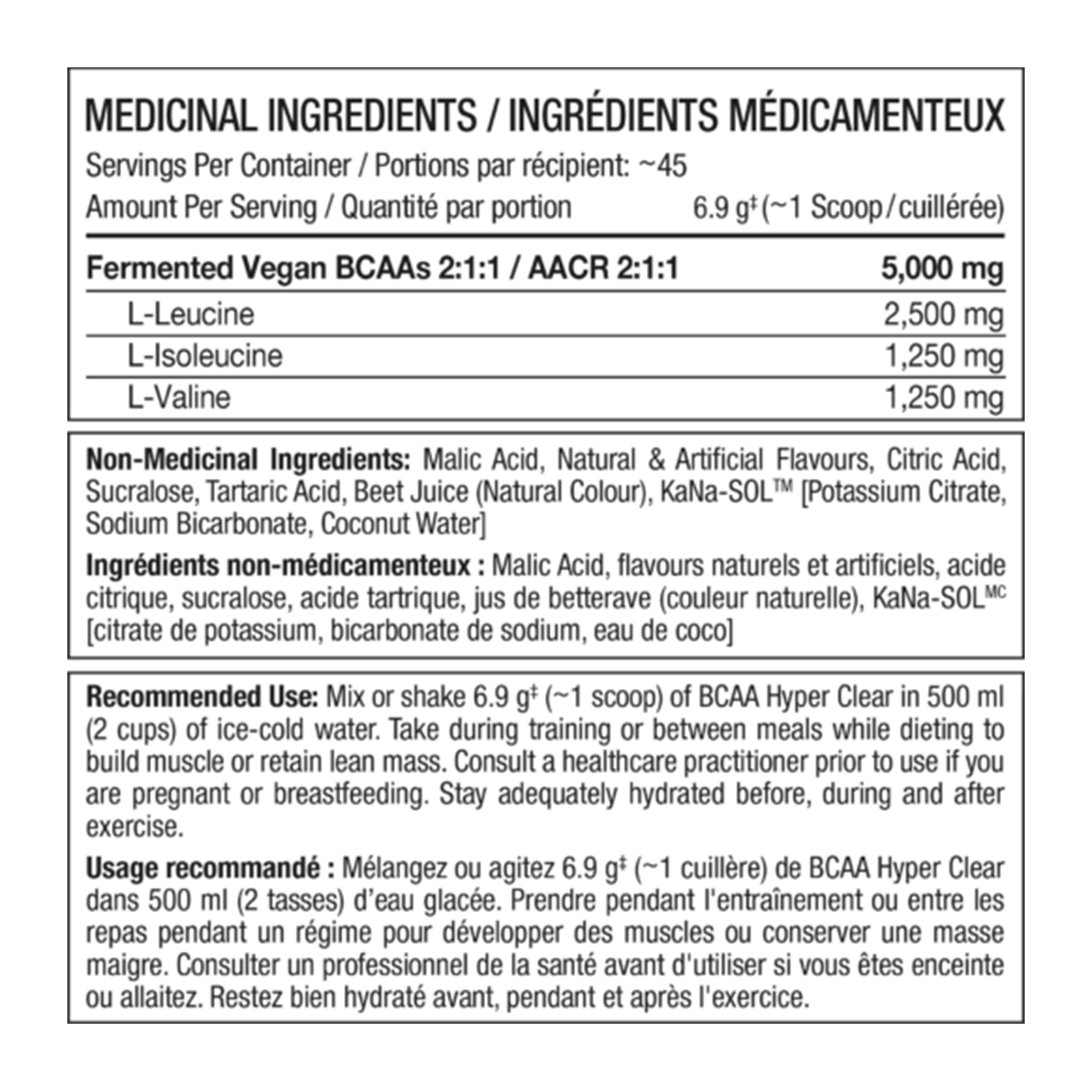 Mix or shake 6.9 g (~1 scoop) of BCAA Hyper Clear in 500 ml (2 cups) of ice-cold water. Take during training or between meals while dieting to build muscle or retain lean mass. Consult a healthcare practitioner prior to use if you are pregnant or breastfeeding. Stay adequately hydrated before, during and after exercise.