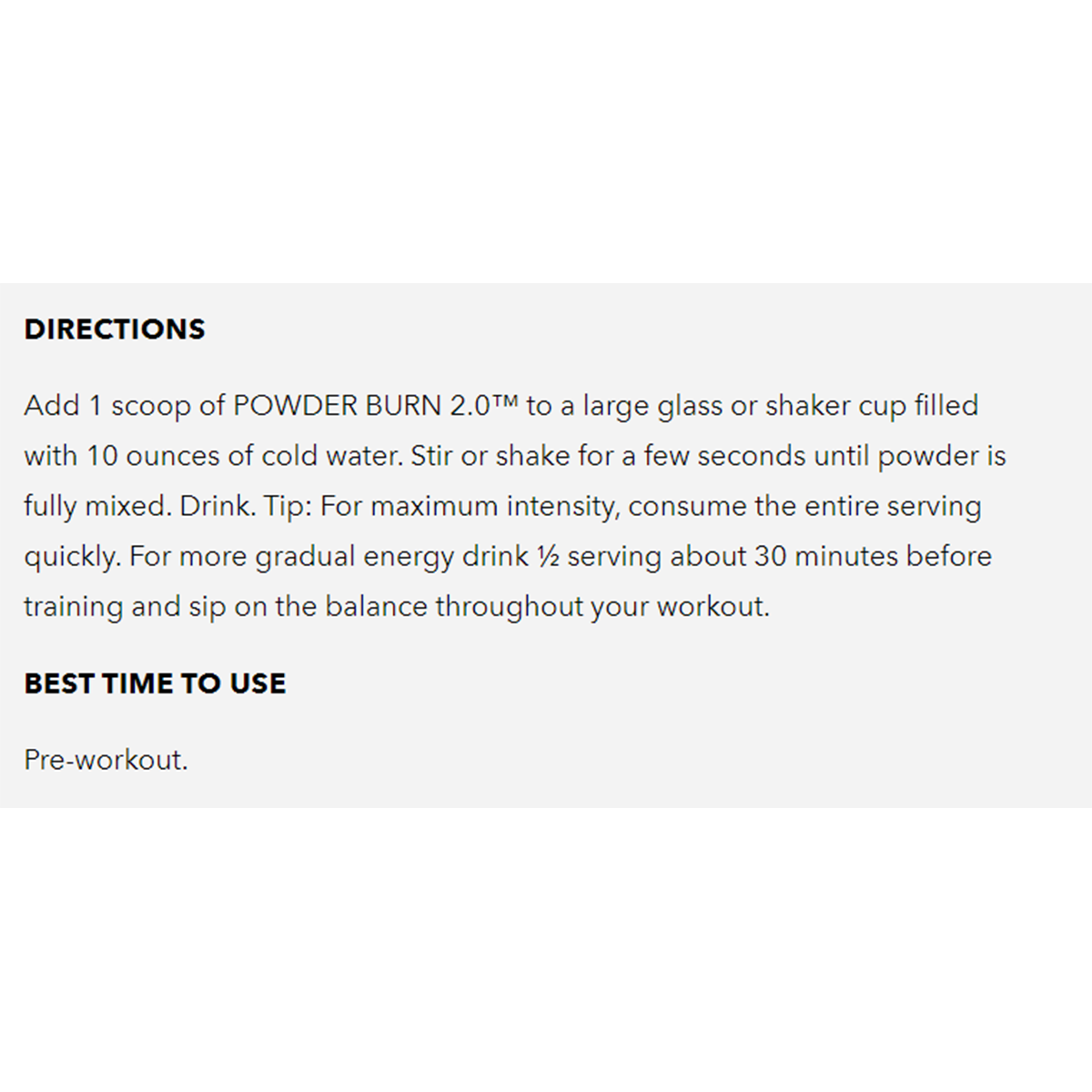 Add 1 scoop of POWDER BURN 2.0 to a large glass or shaker cup filled with 10 ounces of cold water. Stir or shake for a few seconds until powder is fully mixed. Drink. Tip: For maximum intensity, consume the entire serving quickly. For more gradual energy drink ½ serving about 30 minutes before training and sip on the balance throughout your workout.