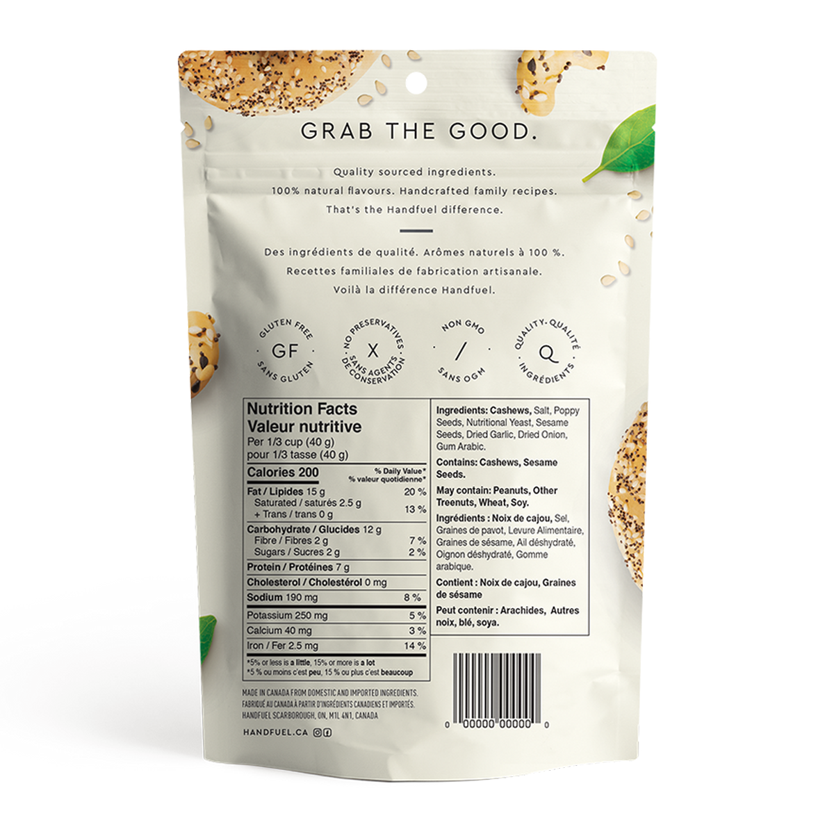 Cashews, Salt, Poppy Seeds, Nutritional Yeast, Sesame Seeds, Dried Garlic, Dried Onion, Gum Arabic.