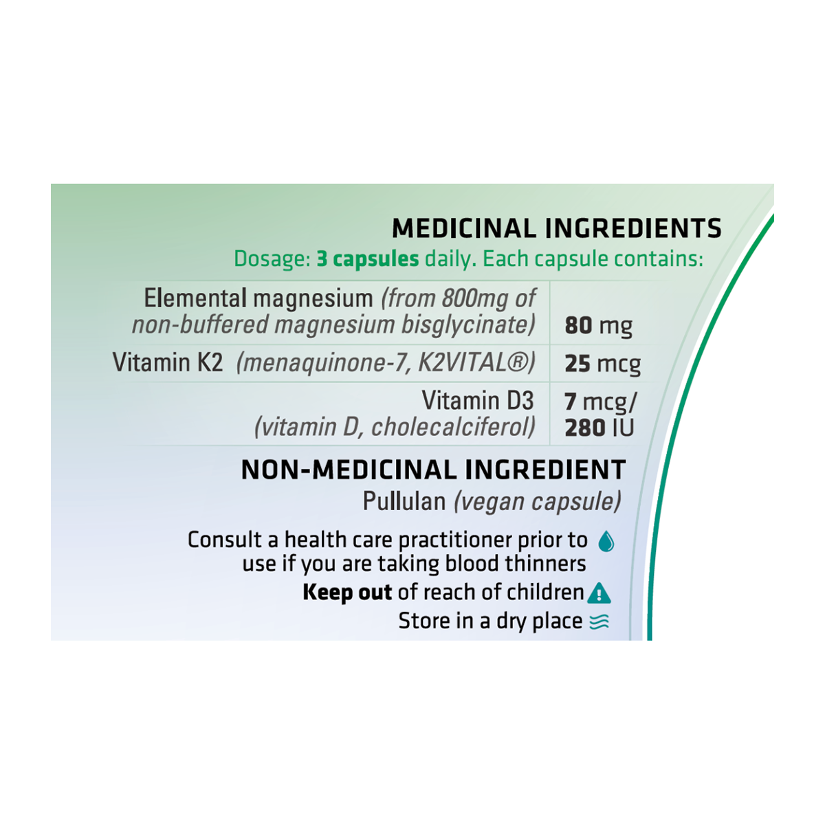 Magnesium, vitamin D3 and vitamin K2 work synergistically to ensure dietary calcium is placed in the bones and teeth and away from unwanted places in the body, such as the organs and blood vessels.