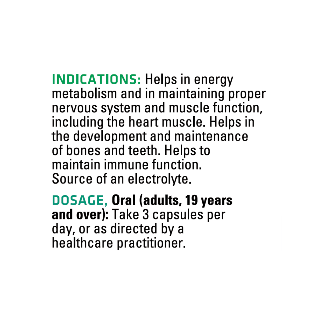 Helps in energy metabolism and in maintaining proper nervous system and muscle function, including the Cardio Health muscle. Helps in the development and maintenance of bones and teeth. Helps to maintain immune function. Source of an electrolyte.