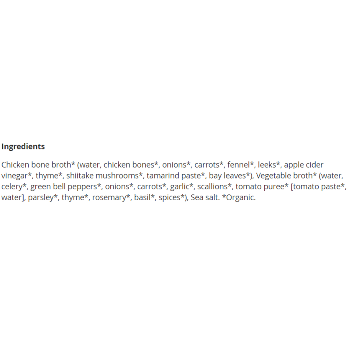 Chicken bone broth* (water, chicken bones*, onions*, carrots*, fennel*, leeks*, apple cider vinegar*, thyme*, shiitake mushrooms*, tamarind paste*, bay leaves*), Vegetable broth* (water, celery*, green bell peppers*, onions*, carrots*, garlic*, scallions*, tomato puree* [tomato paste*, water], parsley*, thyme*, rosemary*, basil*, spices*), Sea salt. *Organic.