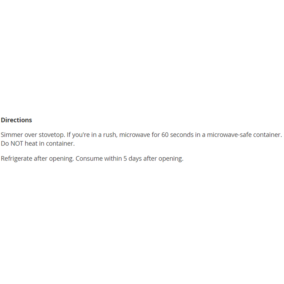 Simmer over stovetop. If you're in a rush, microwave for 60 seconds in a microwave-safe container. Do NOT heat in container.