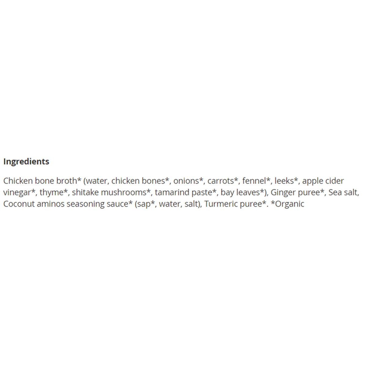 Chicken bone broth* (water, chicken bones*, onions*, carrots*, fennel*, leeks*, apple cider vinegar*, thyme*, shitake mushrooms*, tamarind paste*, bay leaves*), Ginger puree*, Sea salt, Coconut aminos seasoning sauce* (sap*, water, salt), Turmeric puree*. *Organic