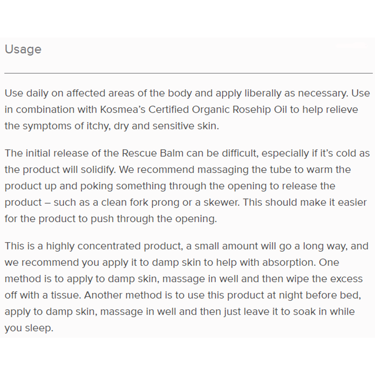 Use daily on affected areas of the body and apply liberally as necessary. Use in combination with Kosmea's Certified Organic Rosehip Oil to help relieve the symptoms of itchy, dry and sensitive skin. The initial release of the Rescue Balm can be difficult, especially if it's cold as the product will solidify. We recommend massaging the tube to warm the product up and poking something through the opening to release the product - such as a clean fork prong or a skewer. This should make it easier for the product to push through the opening. This is a highly concentrated product, a small amount will go a long way, and we recommend you apply it to damp skin to help with absorption. One method is to apply to damp skin, massage in well and then wipe the excess off with a tissue. Another method is to use this product at night before bed, apply to damp skin, massage in well and then just leave it to soak in while you sleep.