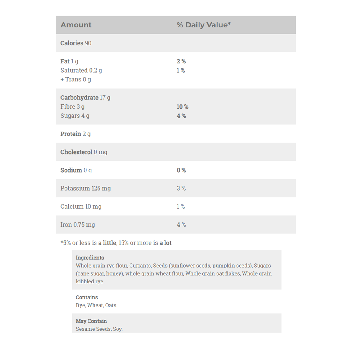 Whole grain rye flour, Currants, Seeds (sunflower seeds, pumpkin seeds), Sugars (cane sugar, honey), whole grain wheat flour, Whole grain oat flakes, Whole grain kibbled rye.