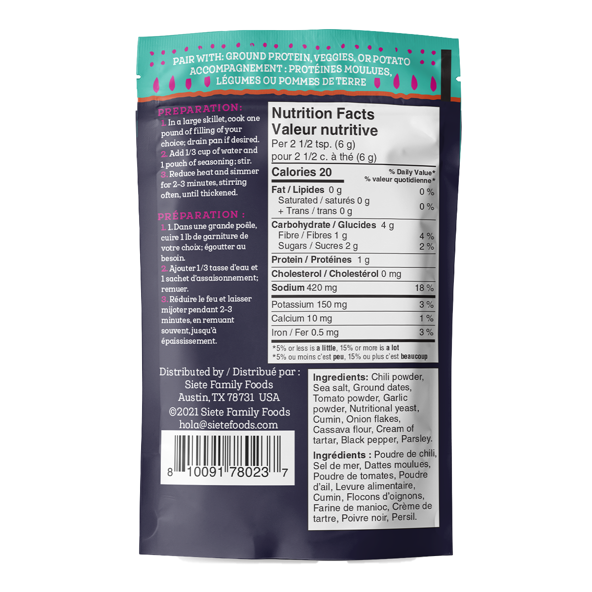 Chili powder, Sea salt, Ground dates, Tomato powder, Garlic powder, Nutritional yeast, Cumin, Onion flakes, Cassava flour, Cream of tartar, Black pepper, Parsley.