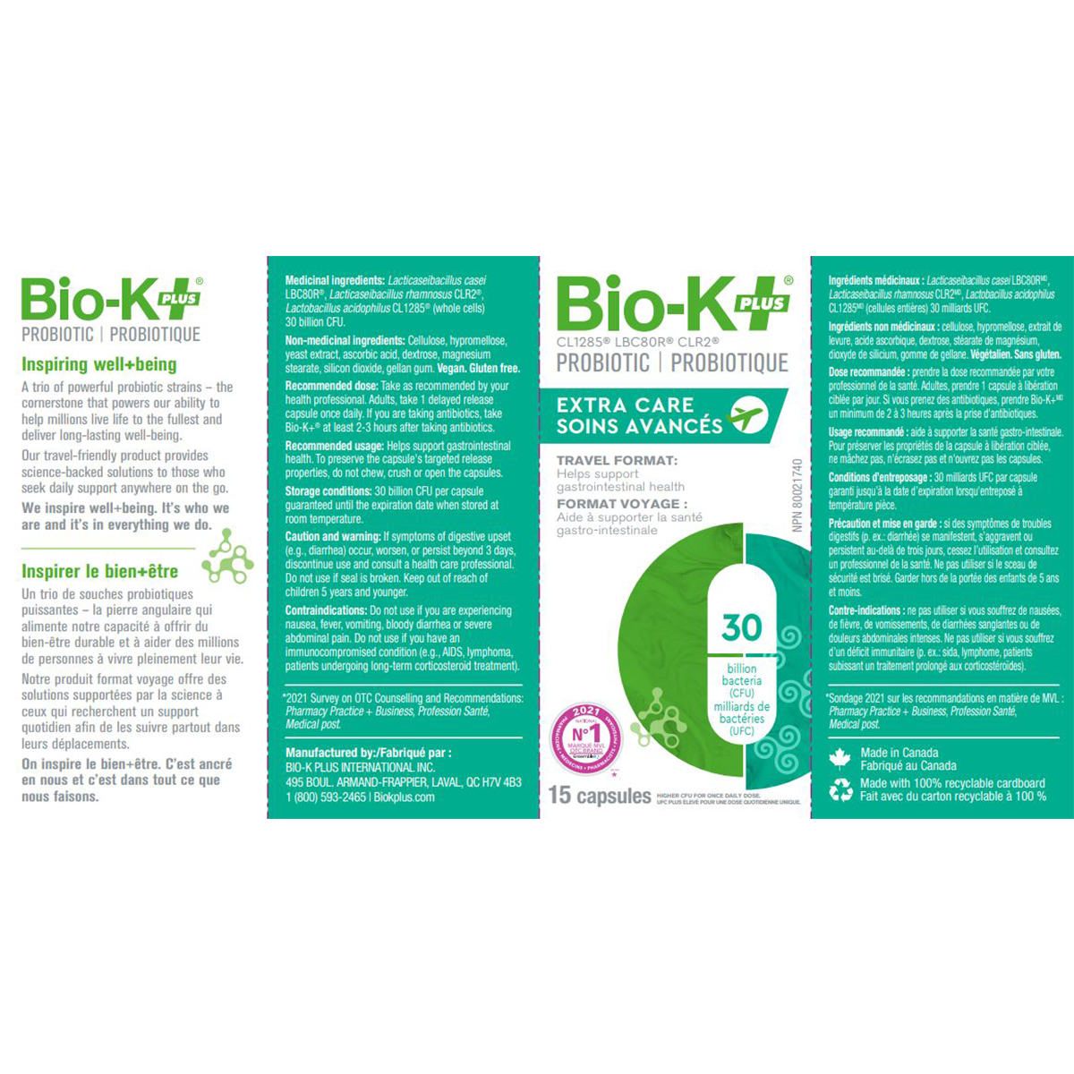 Wellness-Car-efully developed to promote a healthy gut flora and Aid gastrointestinal health, Bio-K+ daily probiotic capsule supplements are available in a wide array of potencies. This unique formula contains bacteria of human origin that can be found naturally in the gut. Each probiotic strain works together to keep the probiotic bacteria alive, healthy, and effective. Plus, with delayed-release technology, the different strains are protected to ensure that the good bacteria can be efficiently delivered to the digestive tract, thus promoting a healthy and balanced intestinal flora to Aid overall health and well+being. With 30 billion CFU of probiotic bacteria, our Bio-K+ Extra Wellness-Car-e Travel product is a great option for those who need extra Aid daily, even when travelling; our strongest alternative for more benefits.