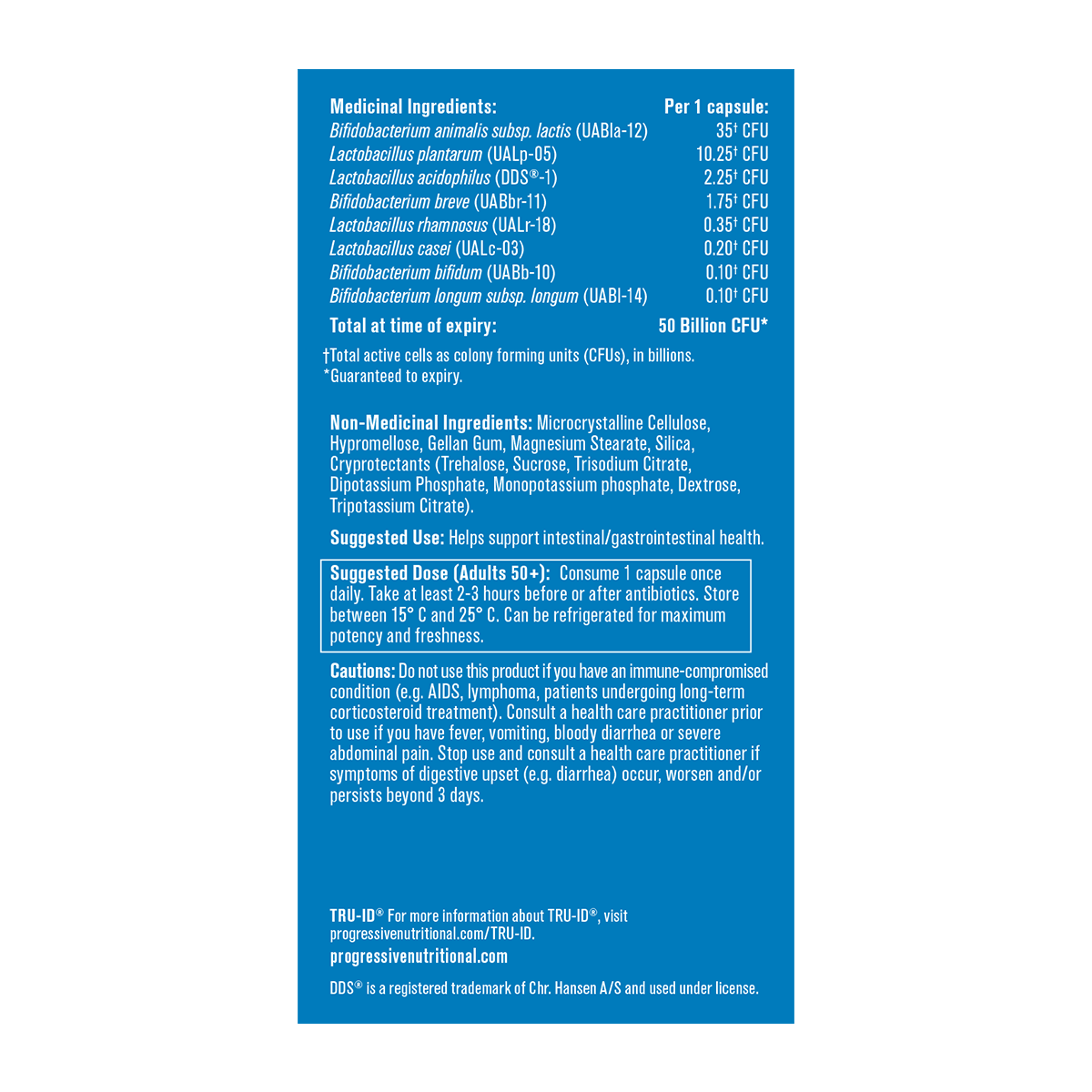 Perfect Probiotic Adults 50+ 50 Billion is specially formulated with a higher ratio of Bifidobacteria probiotic strains to Aid the digestive health of Adults 50+. Featuring 8 probiotic strains to Aid your entire digestive tract in a delayed-release vegetable capsule. Plus, it's part of the world's first TRU-ID-certified probiotic family; guaranteed to include every species on the label.