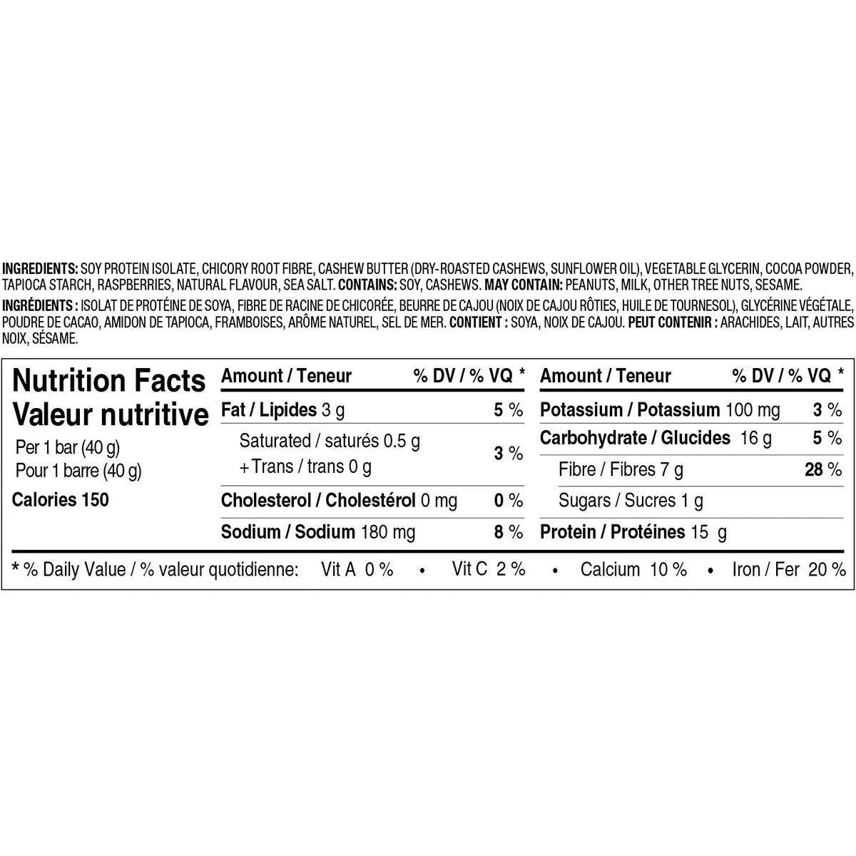 Soy protein crisps (soy protein isolate, tapioca starch, sea salt), Chicory root fibre, Sunflower seeds, Gluten-free oats, Cashew butter (dry-roasted cashews, sunflower oil), Vegetable glycerin, Unsweetened chocolate, Brown rice crisps (brown rice), Cocoa powder, Cane sugar, Raspberries, Natural flavours, Sunflower oil blend (sunflower oil, mixed tocopherols, rosemary extract), Sea salt.