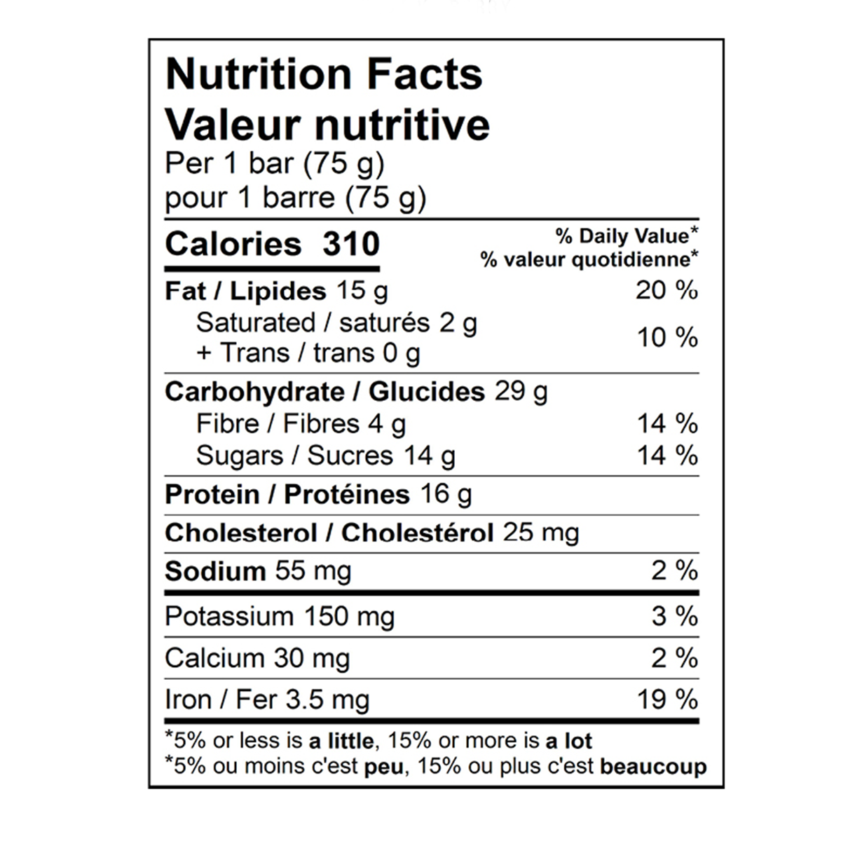 Saskatoon berry, Unpasteurized honey, Peanuts, Whey protein blend (whey protein concentrate, whey protein isolate, whey protein hydrolysate, natural flavours, lecithin, xanthan gum, stevia leaf extract), Rice crisps (rice, sugar, salt, corn and barley malt extract, sunflower lecithin), Sunflower seeds, De-hulled hemp seeds, Roasted peanuts, Whole grain rolled oats, Ground flax seeds, Oat bran, Natural flavour, Red beet powder, Citric acid.
