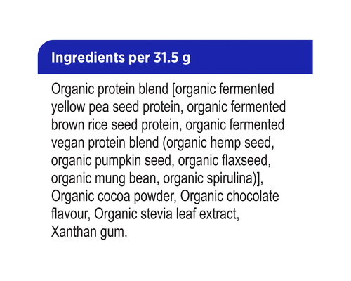 Organic protein blend [organic fermented yellow pea seed protein, organic fermented brown rice seed protein, organic fermented vegan protein blend (organic hemp seed, organic pumpkin seed, organic flaxseed, organic mung bean, organic spirulina)], Organic cocoa powder, Organic chocolate flavour, Organic stevia leaf extract, Xanthan gum.