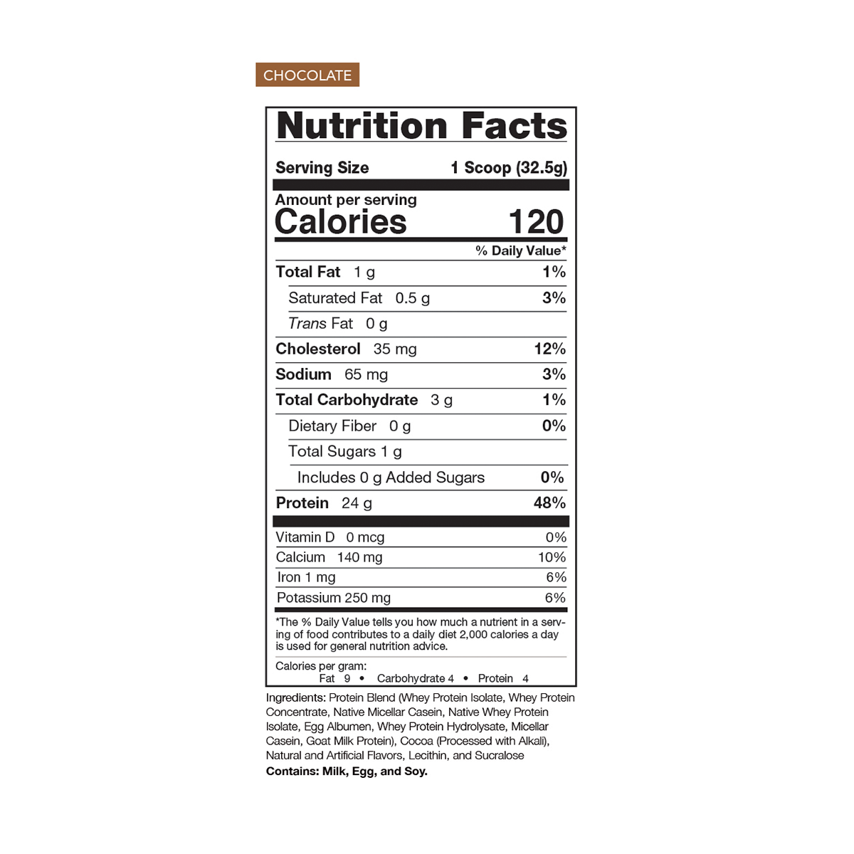 Protein Blend (Whey Protein Isolate, Whey Protein Concentrate, Native Micellar Casein, Native Whey Protein Isolate, Egg Albumen, Whey Protein Hydrolysate, Micellar Casein, Goat Milk Protein), Cocoa (Processed with Alkali), Natural and Artificial Flavors, Lecithin, and Sucralose