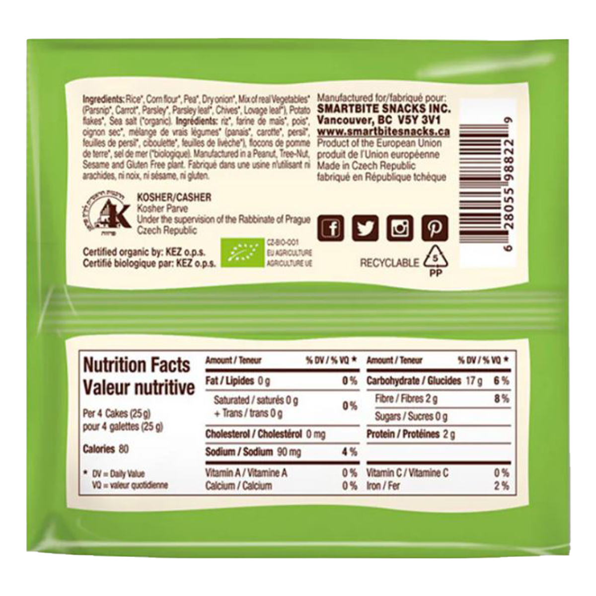 You don't have to be vegan or vegetarian to appreciate the delightful crunch made by these perfectly seasoned corn, rice and vegetable crisps. Packed with green peas, onions, parsnips, carrots, parsley and chives every bag is your secret garden.