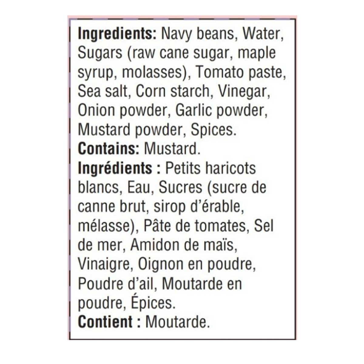 Navy beans, Water, Sugars (raw cane sugar, maple syrup, molasses), Tomato paste, Sea salt, Corn starch, Vinegar, Onion powder, Garlic powder, Mustard powder, Spices.