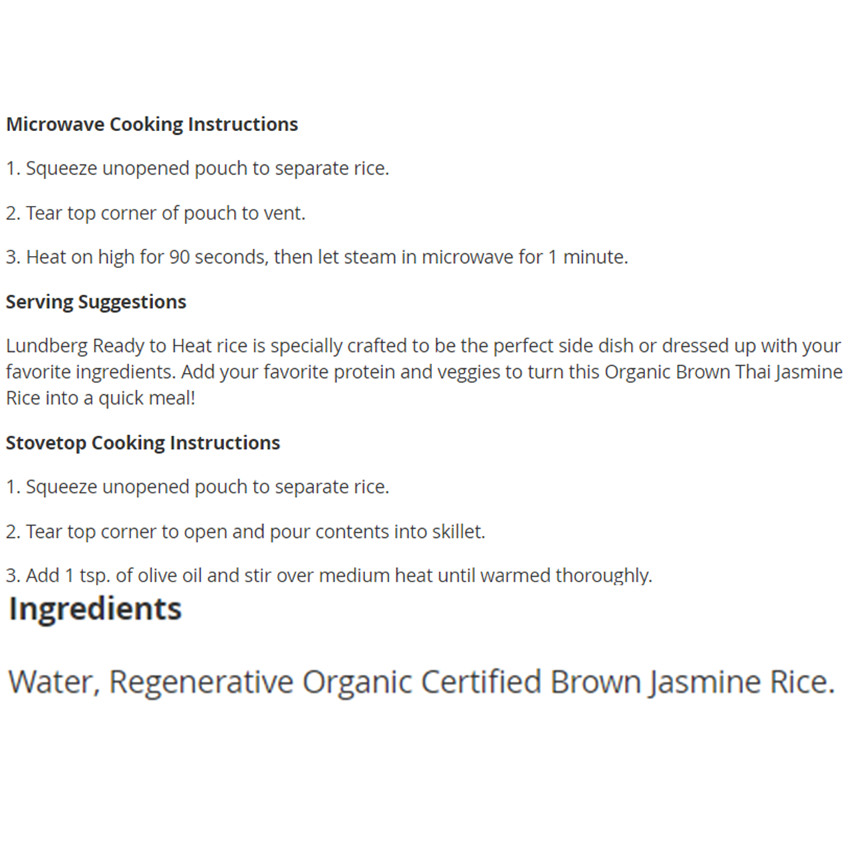 Lundberg Ready to Heat rice is specially crafted to be the perfect side dish or dressed up with your favorite ingredients. Add your favorite protein and veggies to turn this Organic Brown Thai Jasmine Rice into a quick meal!