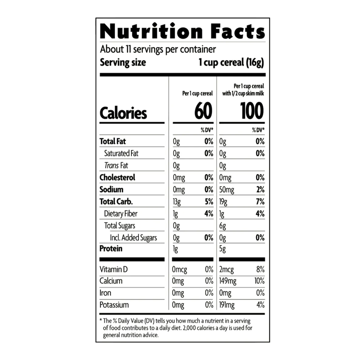 Per 1 cup cereal with 1/2 cup skim milk