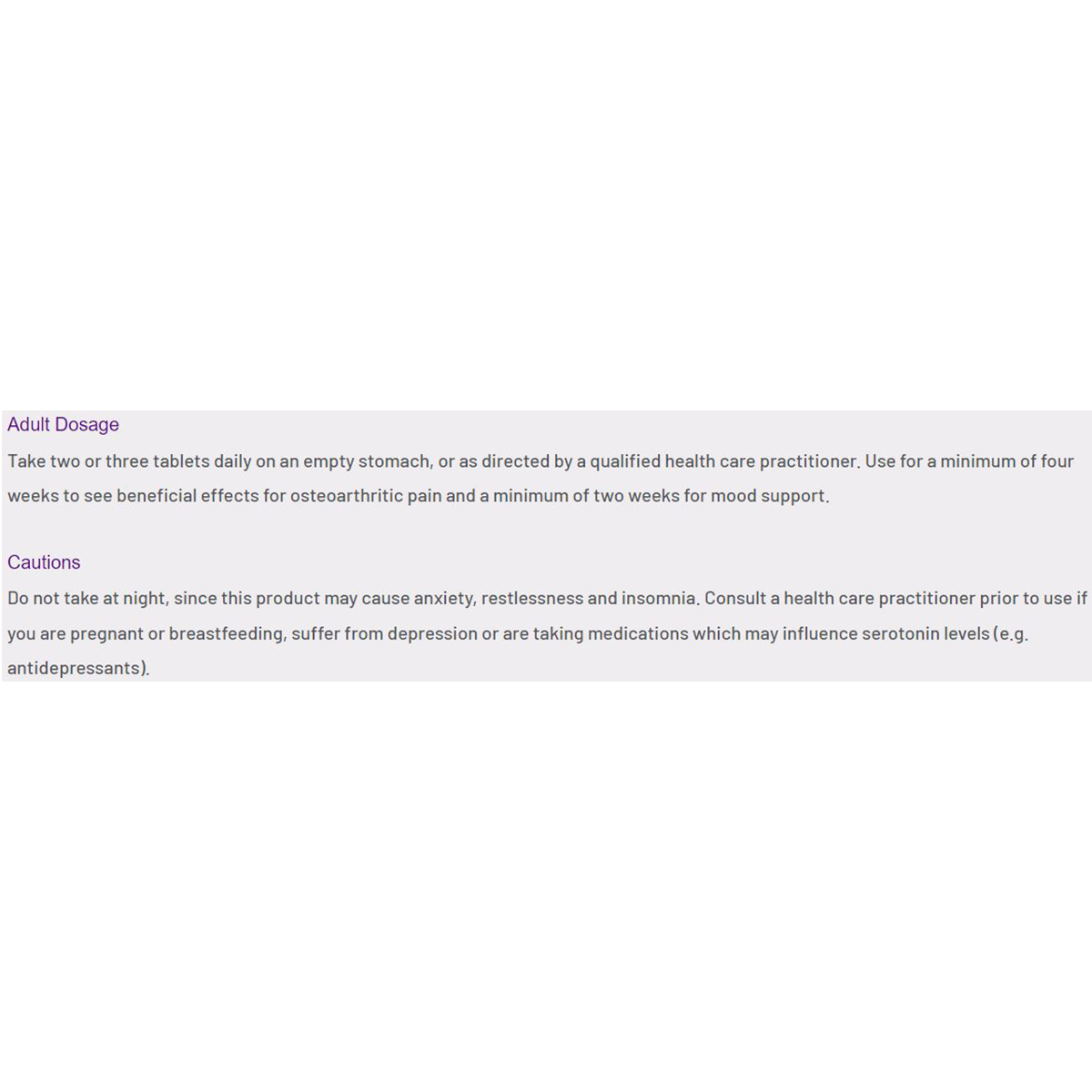 Take two or three tablets daily on an empty stomach, or as directed by a qualified health Wellness-Care practitioner. Use for a minimum of four weeks to see beneficial effects for osteoarthritic pain and a minimum of two weeks for mood Aid.