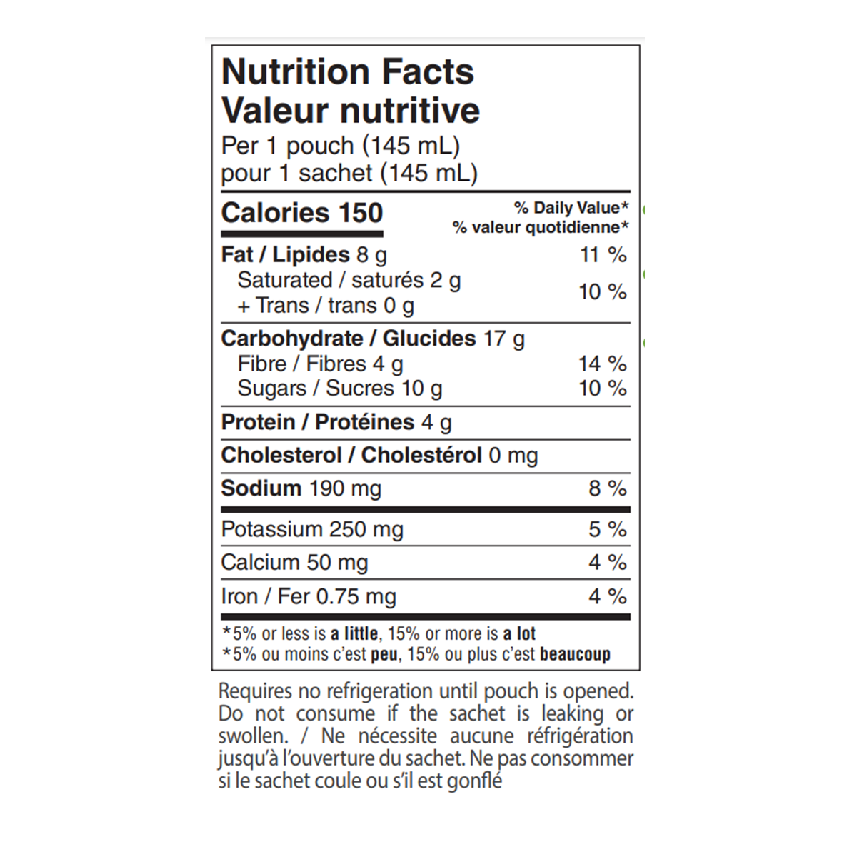 Requires no refrigeration until pouch is opened. Do not consume if the sachet is leaking or swollen.