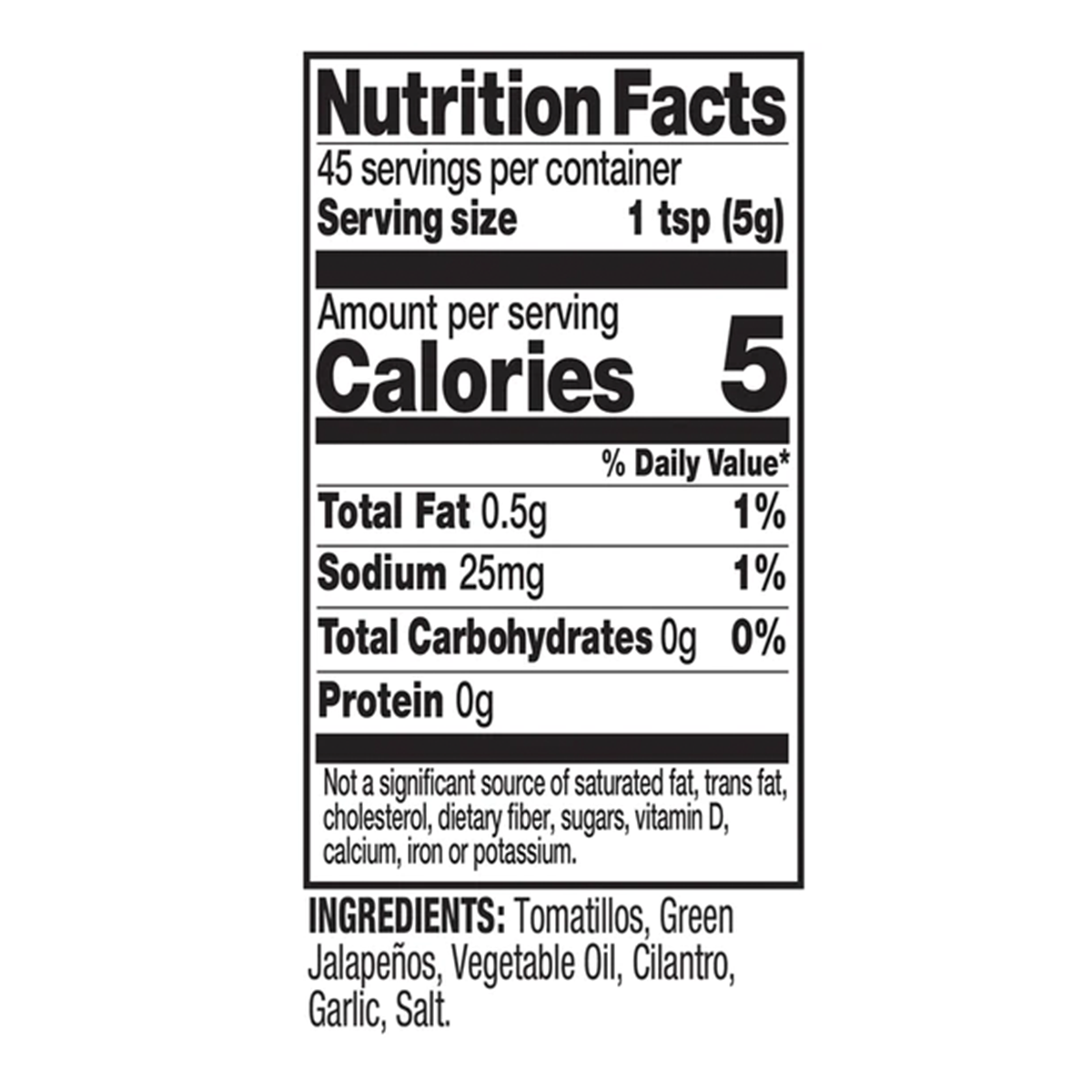 Tomatillos, Green Jalapeños, Vegetable Oil, Cilantro, Garlic, Salt.