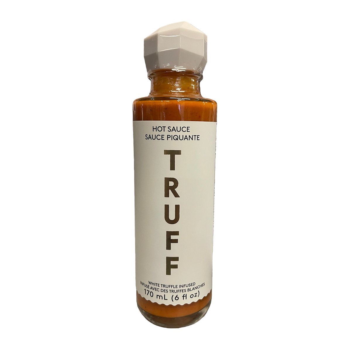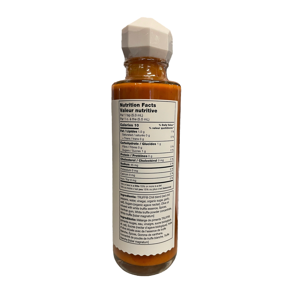 TRUFF Chili blend (red chill peppers, water, vinegar, organic sugar, garlic salt), Sugars (organic agave nectar), Olive oil infused with white truffle essence, Spices. Xanthan gum, White truffle powder concentrat, White truffle