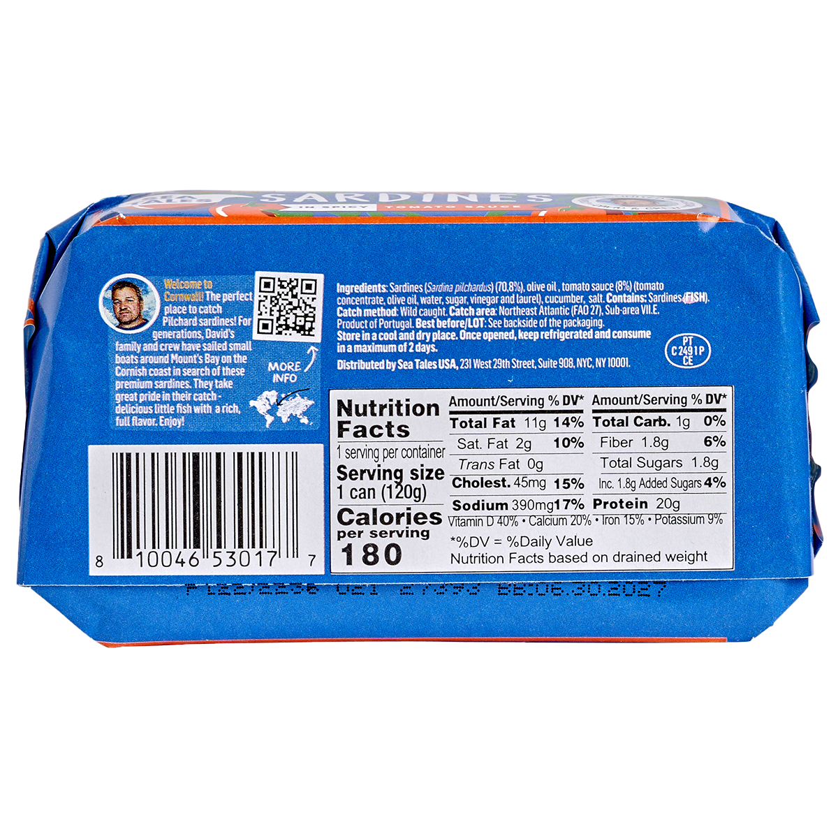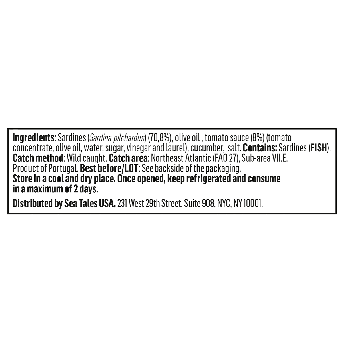 Sardines (Sardina pilchardus) (70,8%), olive oil, tomato sauce (8%) (tomato concentrate, olive oil, water, sugar, vinegar and laurel), cucumber, salt.