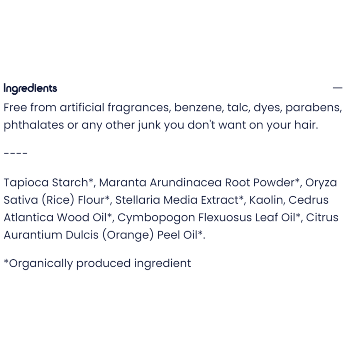 Tapioca Starch*, Maranta Arundinacea Root Powder*, Oryza Sativa (Rice) Flour*, Stellaria Media Extract*, Kaolin, Cedrus Atlantica Wood Oil*, Cymbopogon Flexuosus Leaf Oil*, Citrus Aurantium Dulcis (Orange) Peel Oil*.