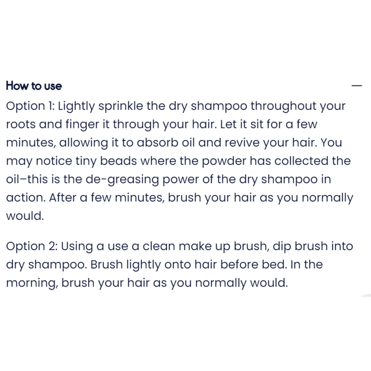 Option 2: Using a use a clean make up brush, dip brush into dry shampoo. Brush lightly onto hair before bed. In the morning, brush your hair as you normally would.