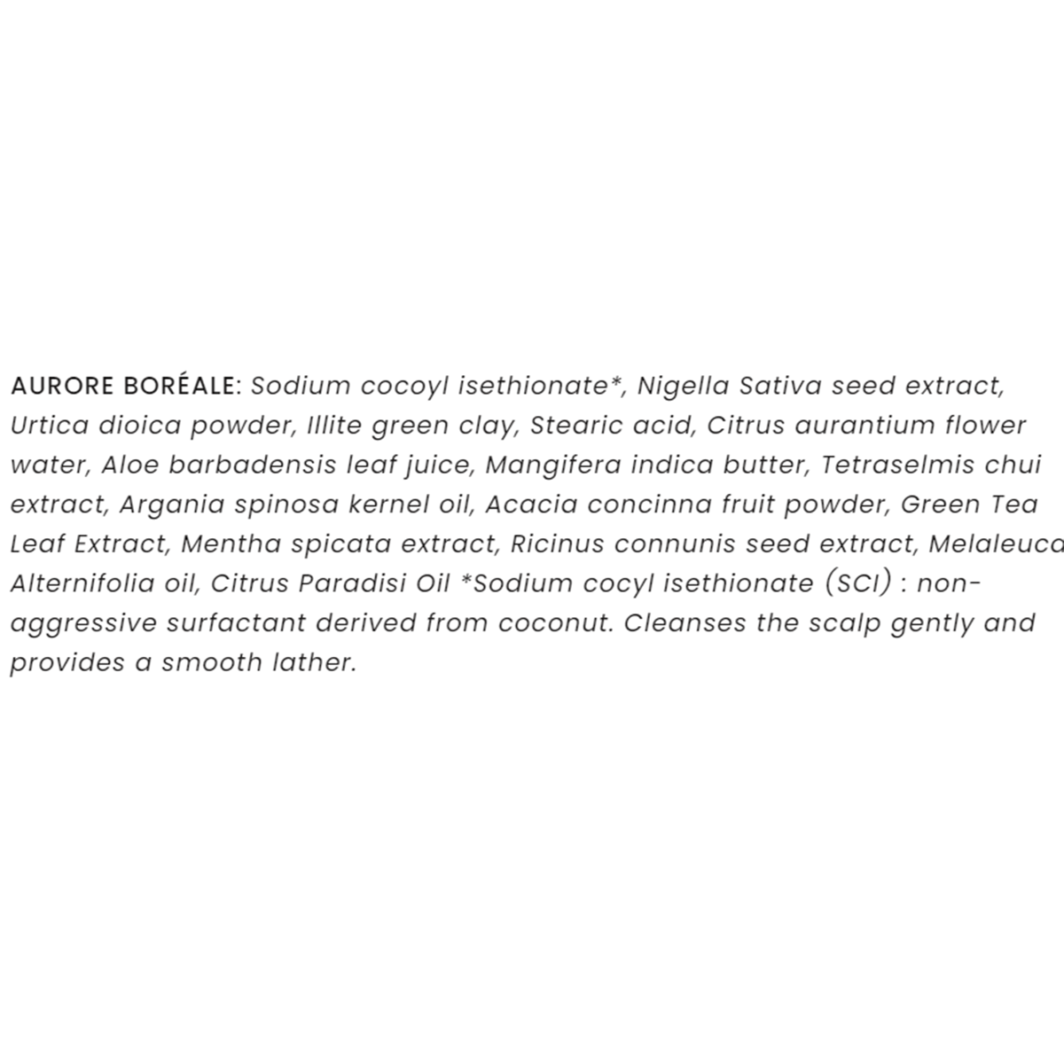Sodium cocoyl isethionate*, Nigella Sativa seed extract, Urtica dioica powder, Illite green clay, Stearic acid, Citrus aurantium flower water, Aloe barbadensis leaf juice, Mangifera indica butter, Tetraselmis chui extract, Argania spinosa kernel oil, Acacia concinna fruit powder, Green Tea Leaf Extract, Mentha spicata extract, Ricinus connunis seed extract, Melaleuca Alternifolia oil, Citrus Paradisi Oil.