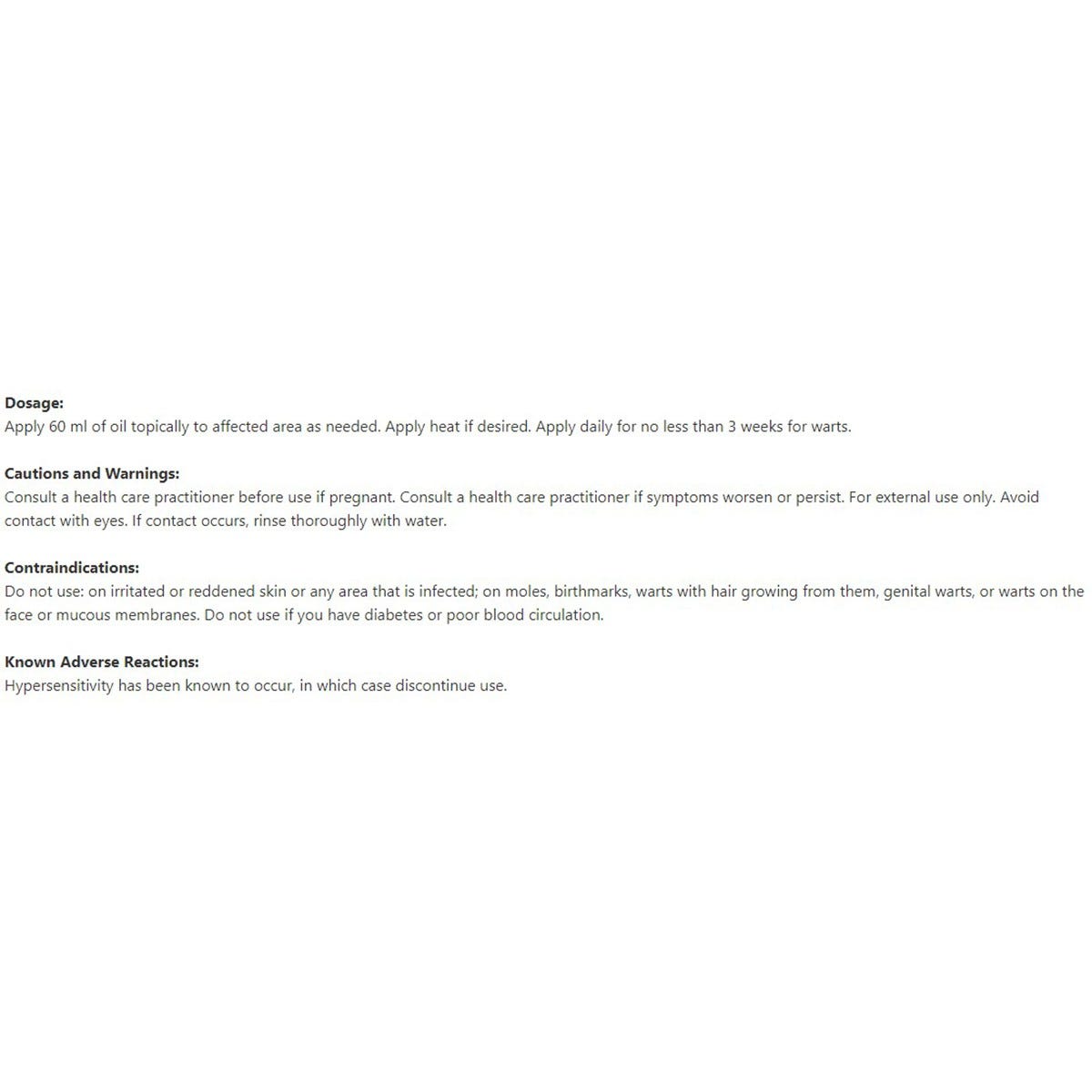 Apply 60 ml of oil topically to affected area as needed. Apply heat if desired. Apply daily for no less than 3 weeks for warts.