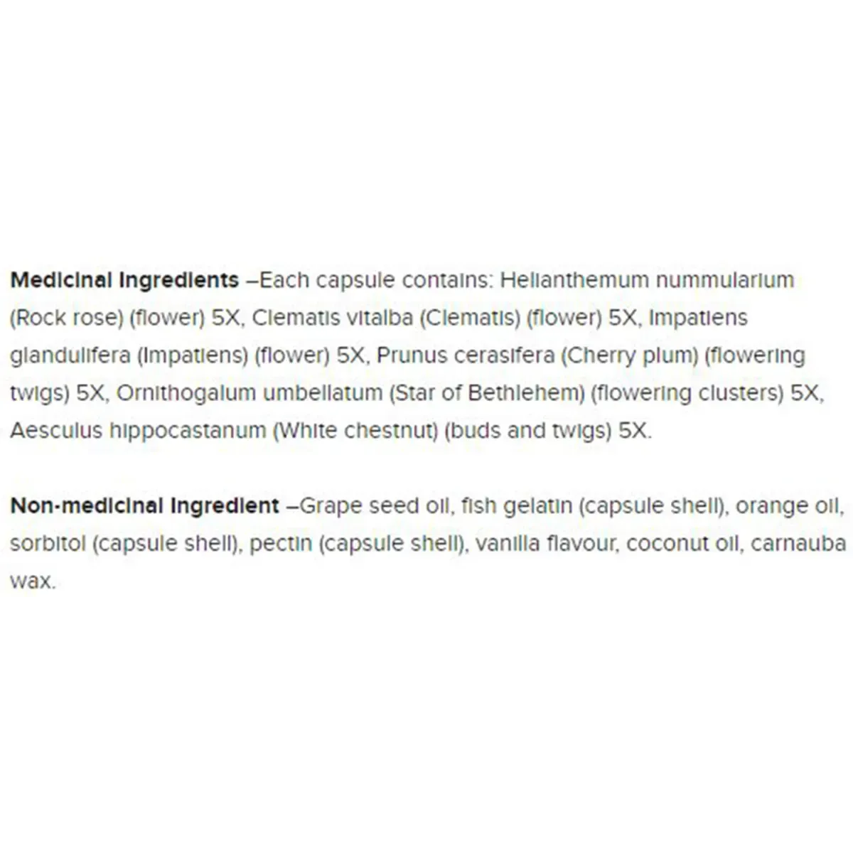 Grape seed oil, fish gelatin (capsule shell), orange oil, sorbitol (capsule shell), pectin (capsule shell), vanilla flavour, coconut oil, and carnauba wax.