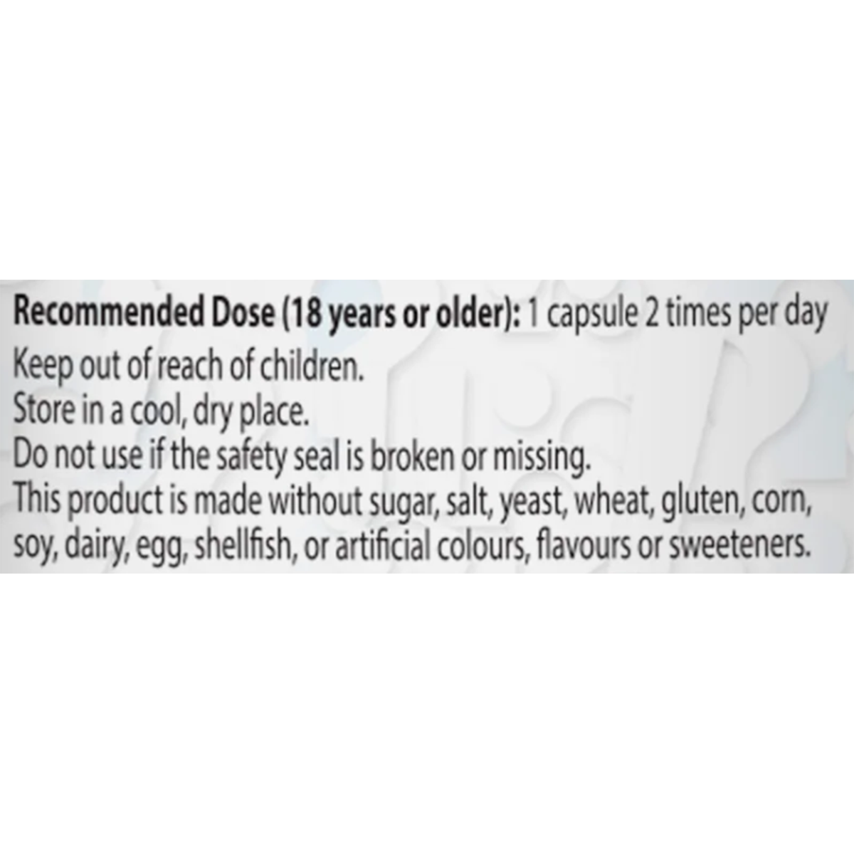 This product is made without sugar, salt, yeast, wheat, gluten, corn, soy, dairy, egg, shellfish, or artificial colours, flavours or sweeteners.