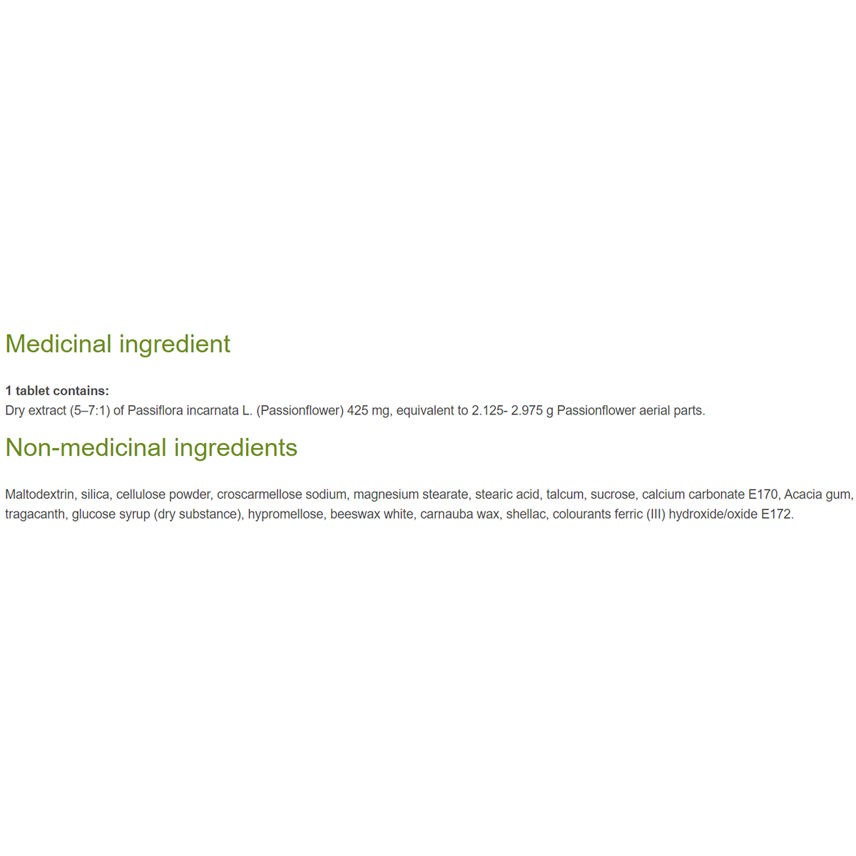 Dry extract (5–7:1) of Passiflora incarnata L. (Passionflower) 425 mg, equivalent to 2.125- 2.975 g Passionflower aerial parts.