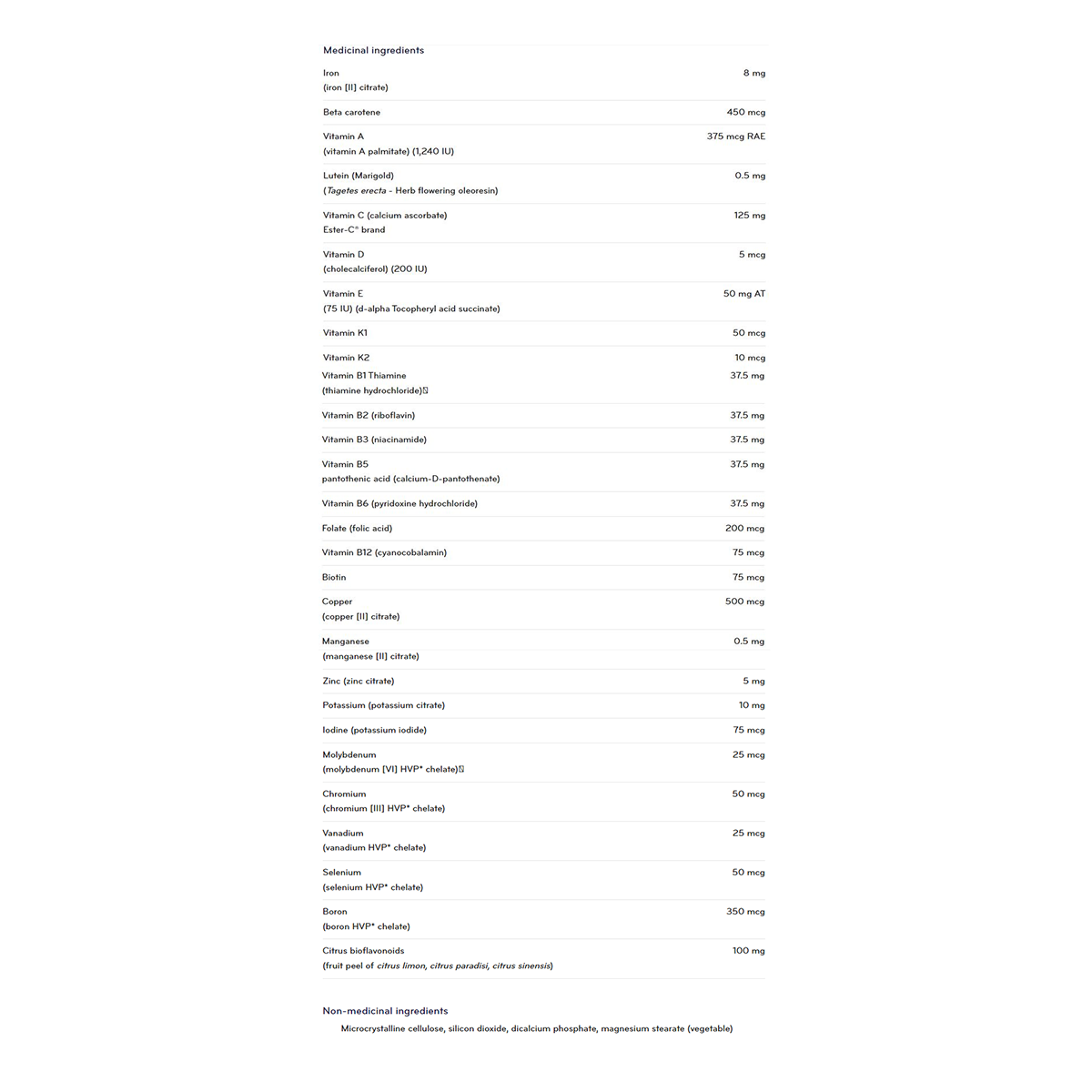 Wide-Ranging Nutrients; Powerful multivitamin complements your Nutrition Plan with Ester-C, vitamin K, boron, lutein, trace minerals and antioxidant bioflavonoids to keep your body functioning at an optimal level.
