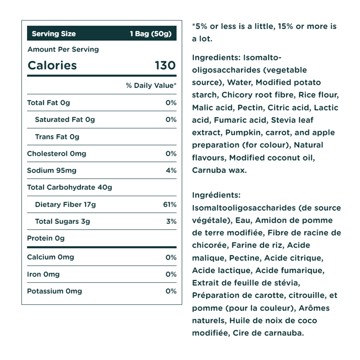 Isomalto-oligosaccharides (vegetable source), Water, Modified potato starch, Chicory root fibre, Rice flour, Malic acid, Pectin, Citric acid, Lactic acid, Fumaric acid, Stevia leaf extract, Pumpkin, carrot, and apple preparation (for colour), Natural flavours, Modified coconut oil, Carnuba wax.